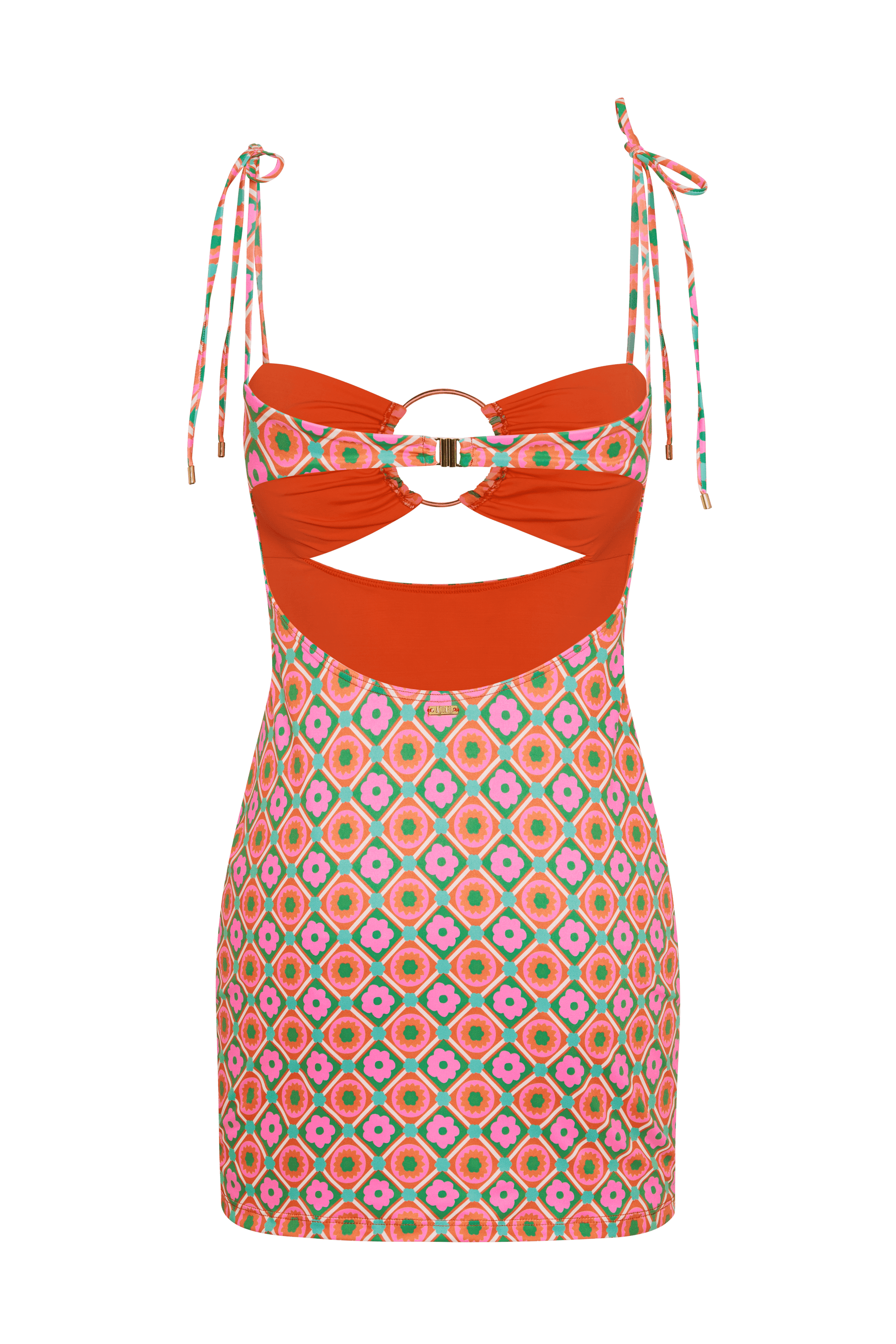 The new Lucia Mini is made for getaways. A ’70s-style gold ring, soft shoulder ties, and an open back keep it effortless and chic. Fully lined and crafted from our glossy recycled nylon, it’s perfect for beach days, sunset dinners, or even a dip.