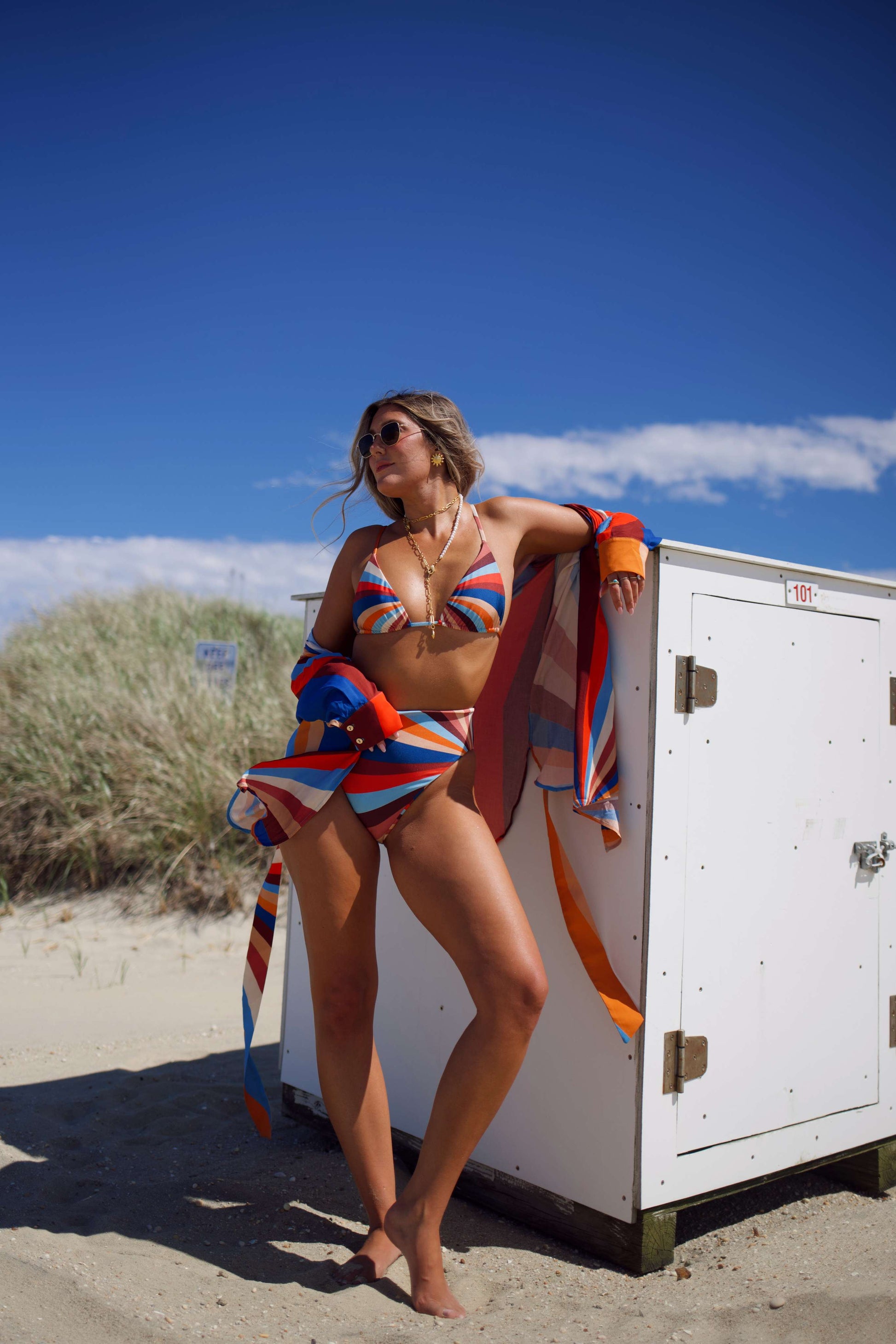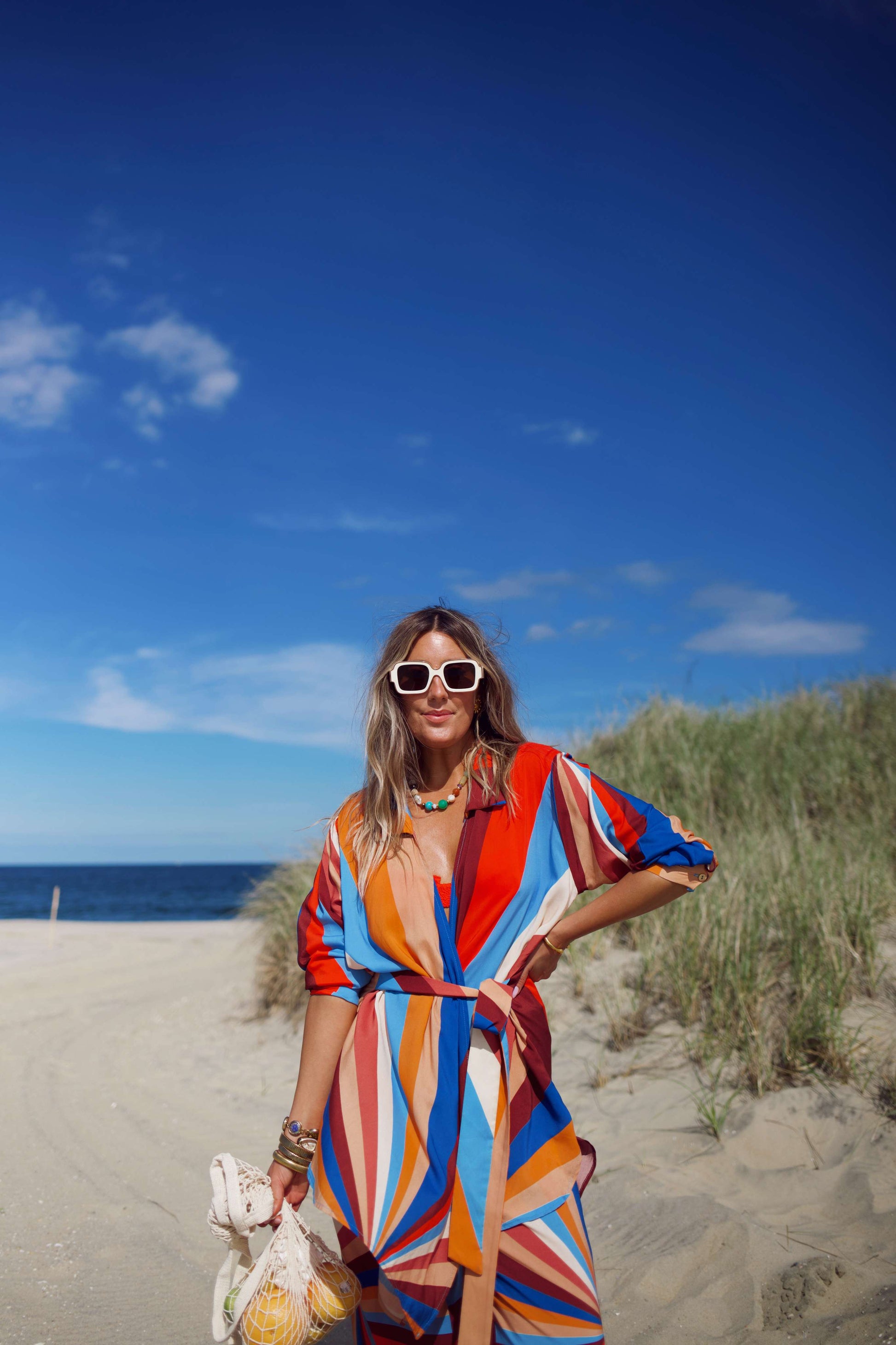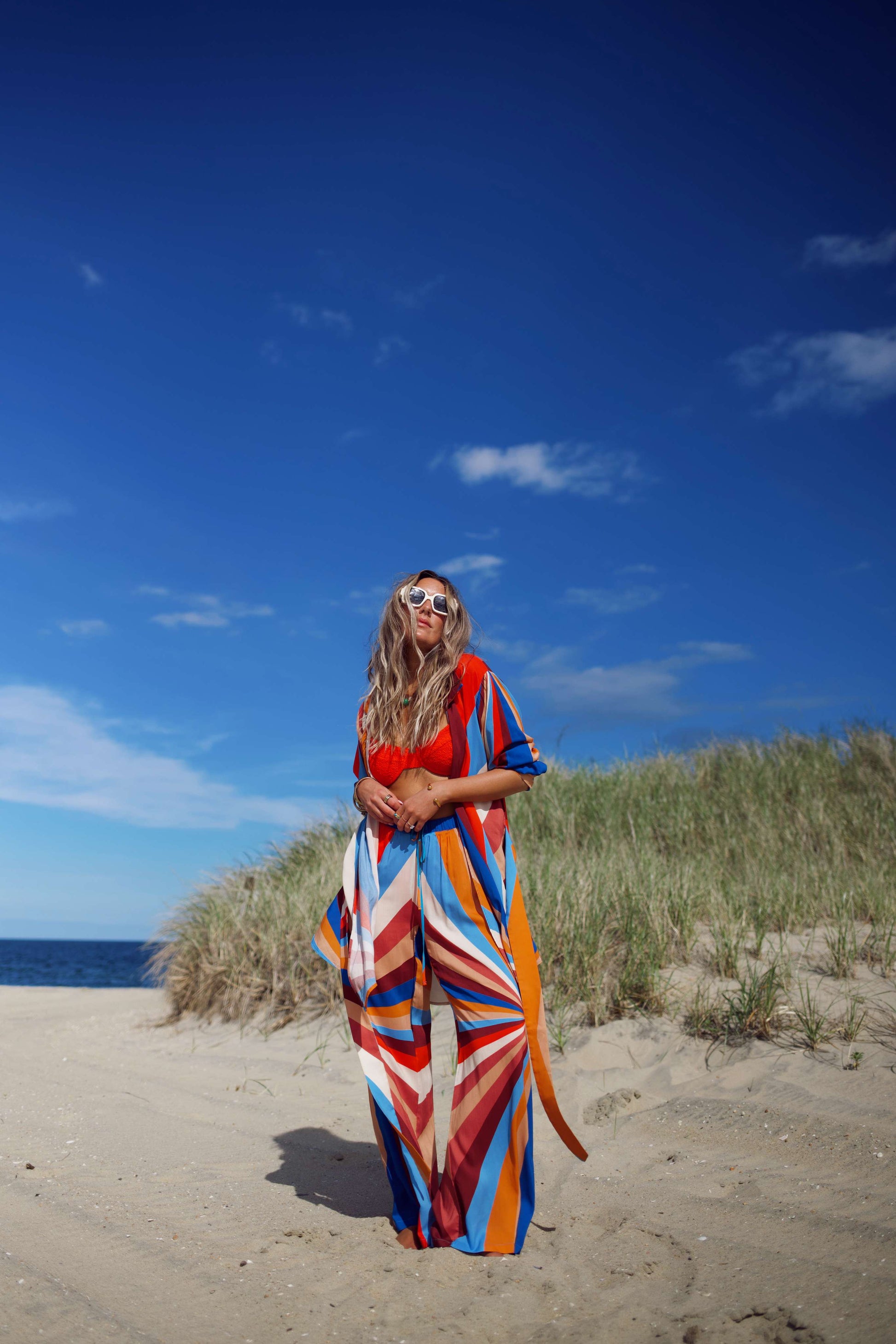 “I love this shirt dress because there are so many ways to tie and wear it! My favorite way is paired back to the matching prismatic pants matched back to the chili swim.”- Caitlyn
