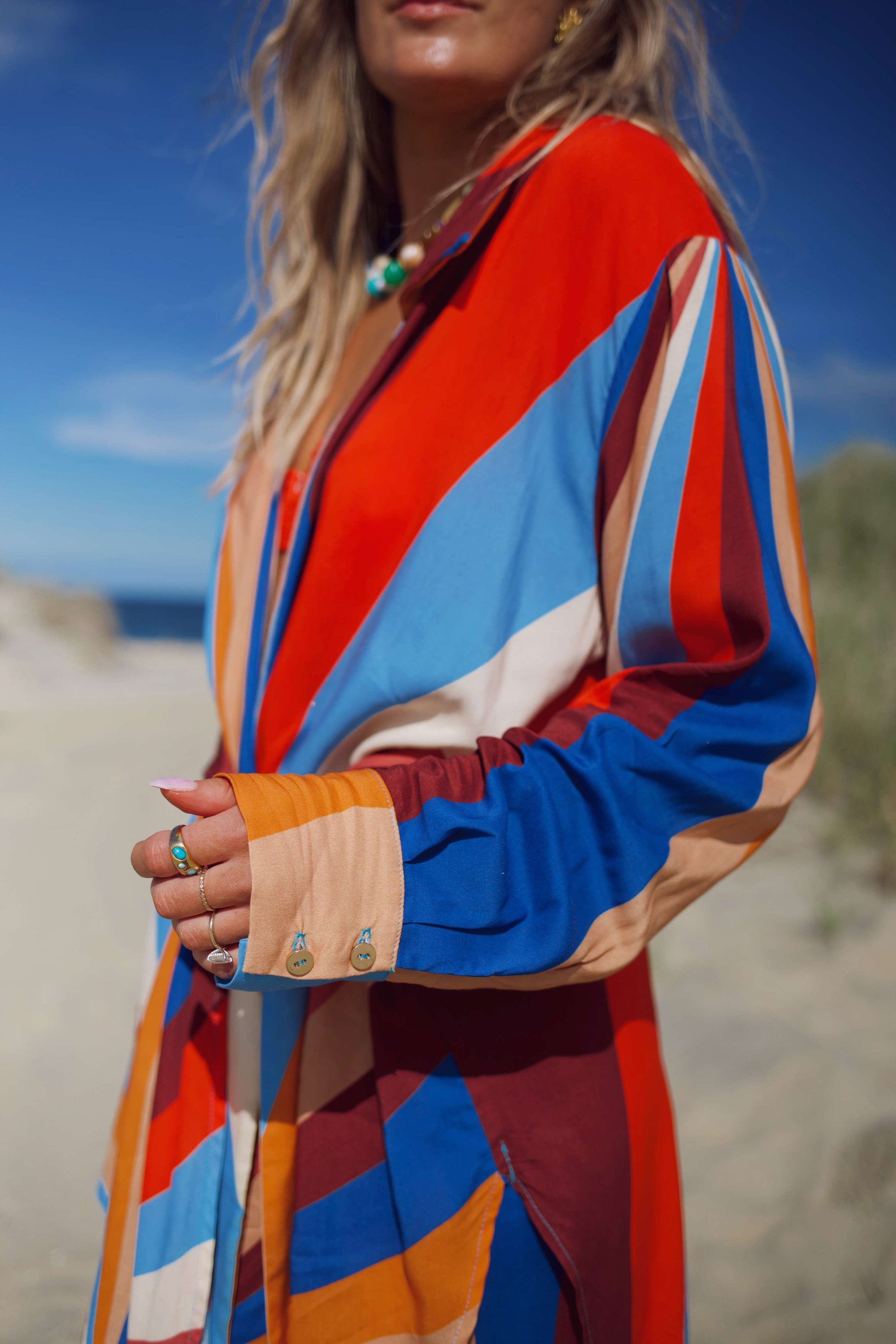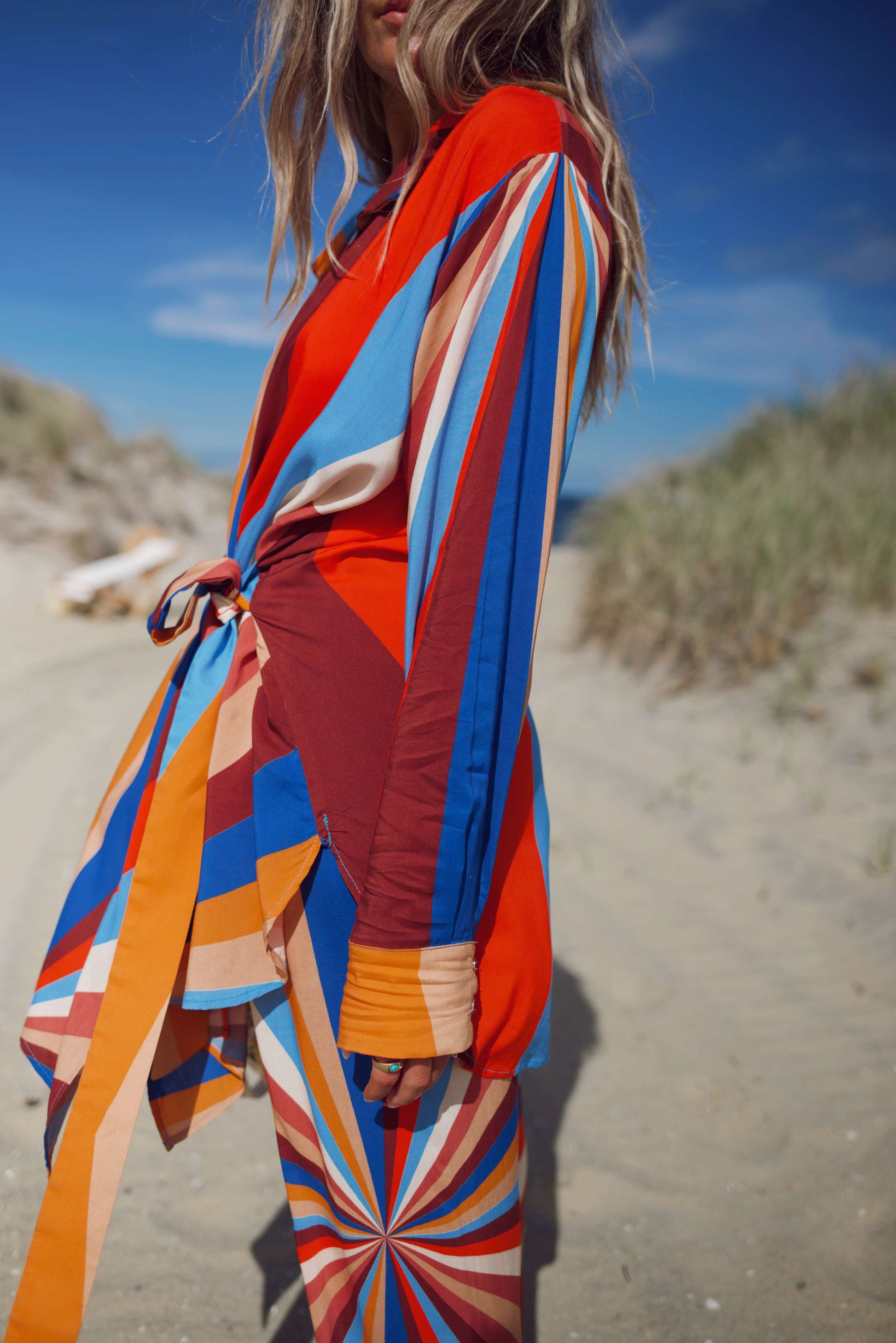 The Paloma Shirt Dress channels bold, colorful ‘70s surfer vibes with its vibrant prismatic print. A versatile piece for the beach and beyond, wear it open with the waist tie as a breezy cover-up or top, wrapped as a flattering mini dress, or styled with the Paloma Pants for a laid-back look. Gold buttons on the cuffs add a subtle vintage shine. Throw it over the matching Caitlyn bikini for a full-on retro beach vibe.