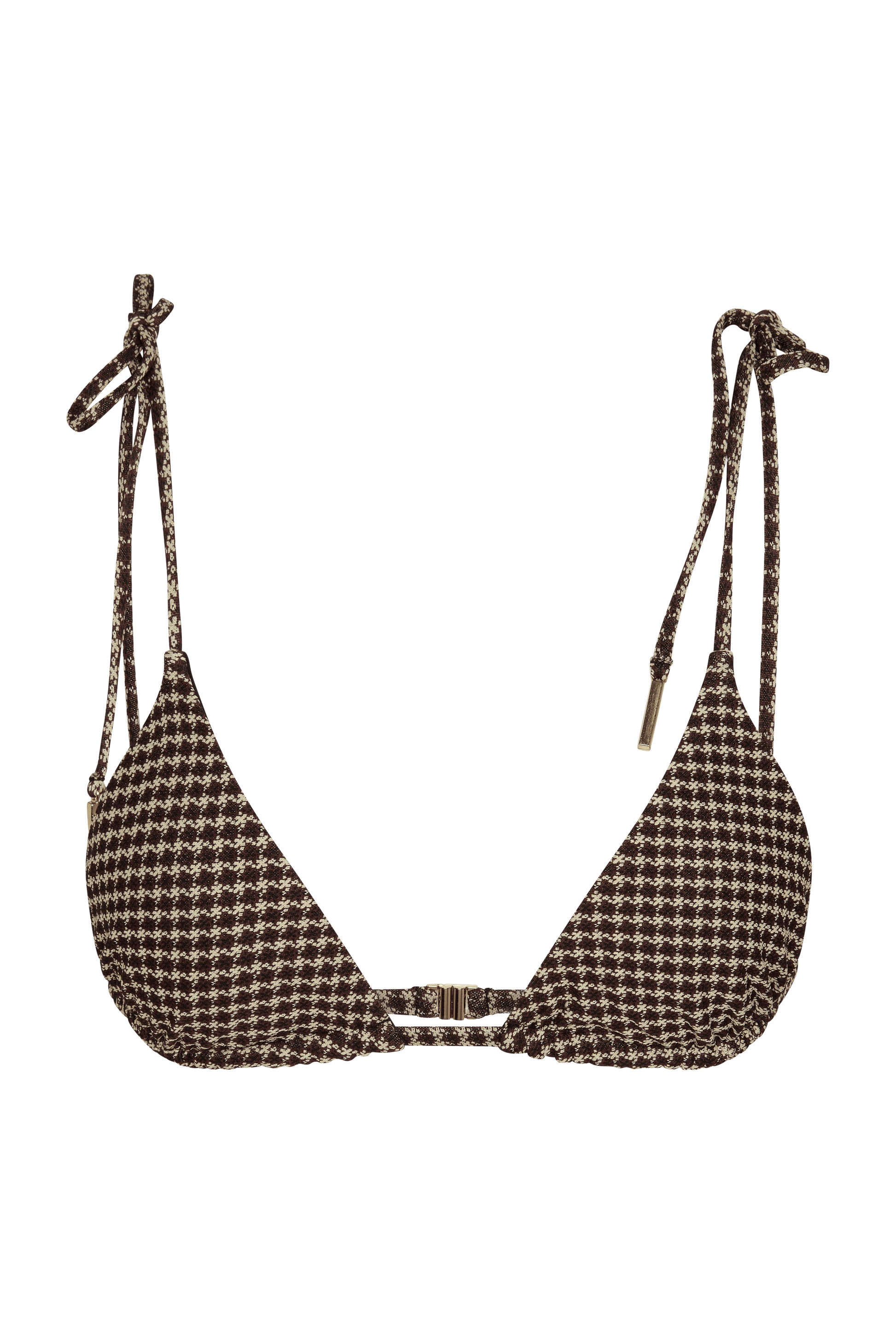 Featuring adjustable shoulder ties with gold hardware accents and a delicate under-bust band with a metal clasp. Crafted from our unique recycled plaid jacquard nylon, it’s made for sun-soaked days and effortless wear.