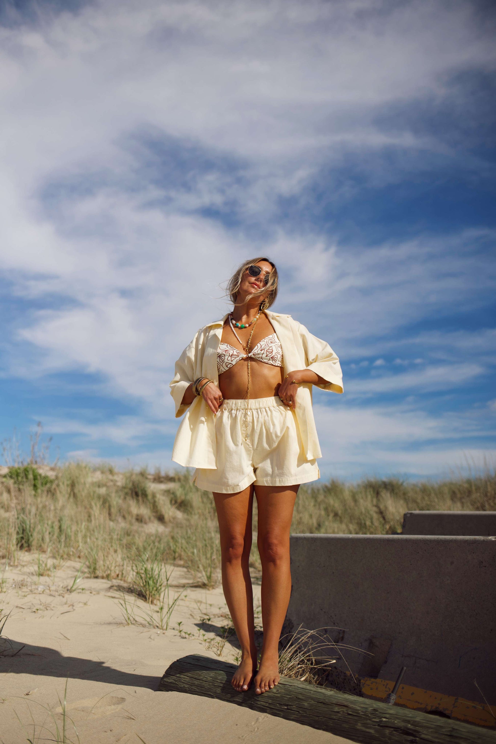 “Set Sail Set - the piece that you can easily pair back to any of our swim - it is a staple. It is this super light almost butter yellow color that is a fresh take on your white button down short set.”- Caitlyn