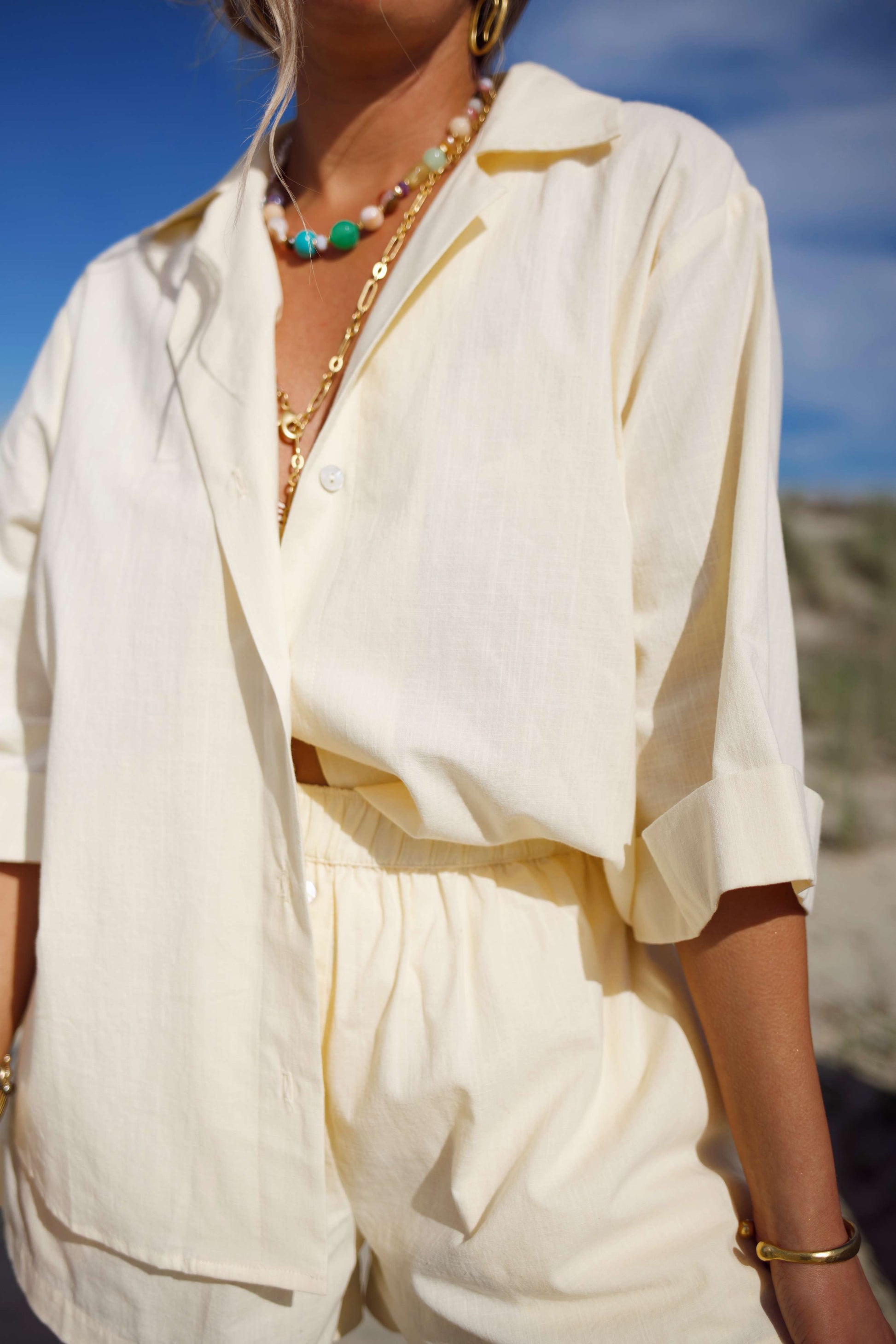 “Set Sail Set - the piece that you can easily pair back to any of our swim - it is a staple. It is this super light almost butter yellow color that is a fresh take on your white button down short set.”- Caitlyn
